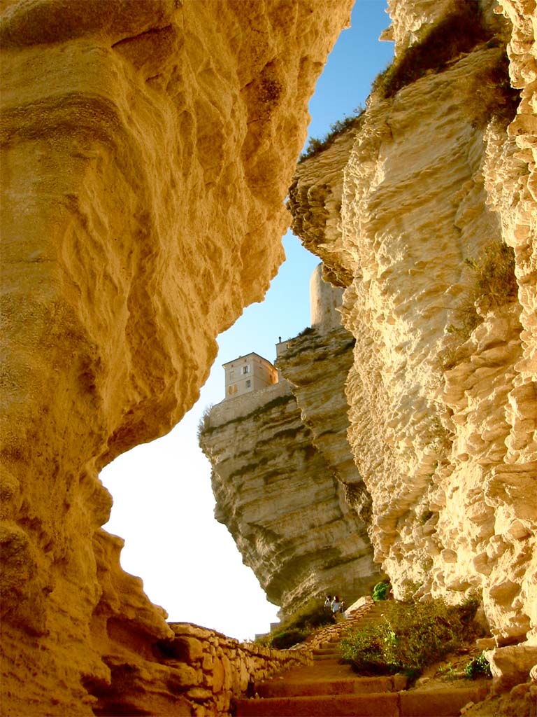 Bonifacio, a city located on the southern tip of the island of Corsica, perched on the top of a chalk-white limestone cliff.